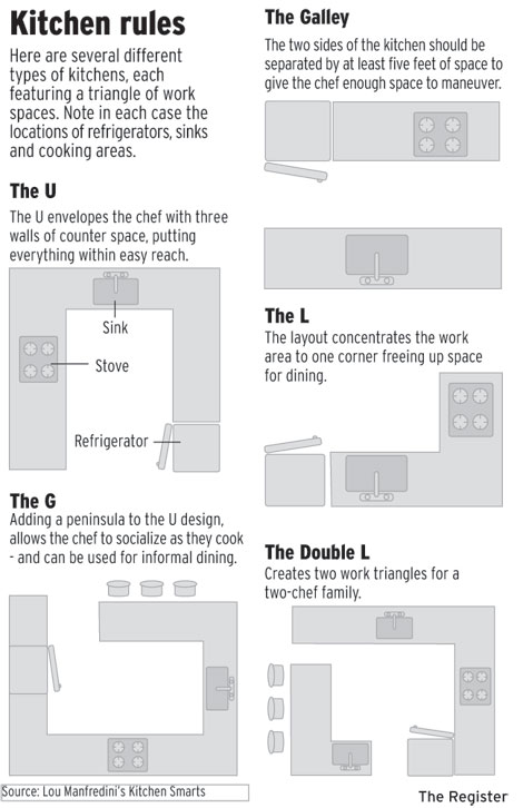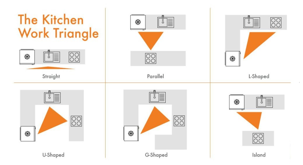 Ketiga-tiga titik dan garis khayalan di antara mereka, membentuk apa yang disebut oleh pakar sebagai segitiga kerja. Ideanya adalah bahawa apabila ketiga-tiga elemen ini berdekatan (tetapi tidak terlalu dekat) antara satu sama lain, dapur akan mudah digunakan dan efisien, mengurangkan langkah-langkah terbuang.